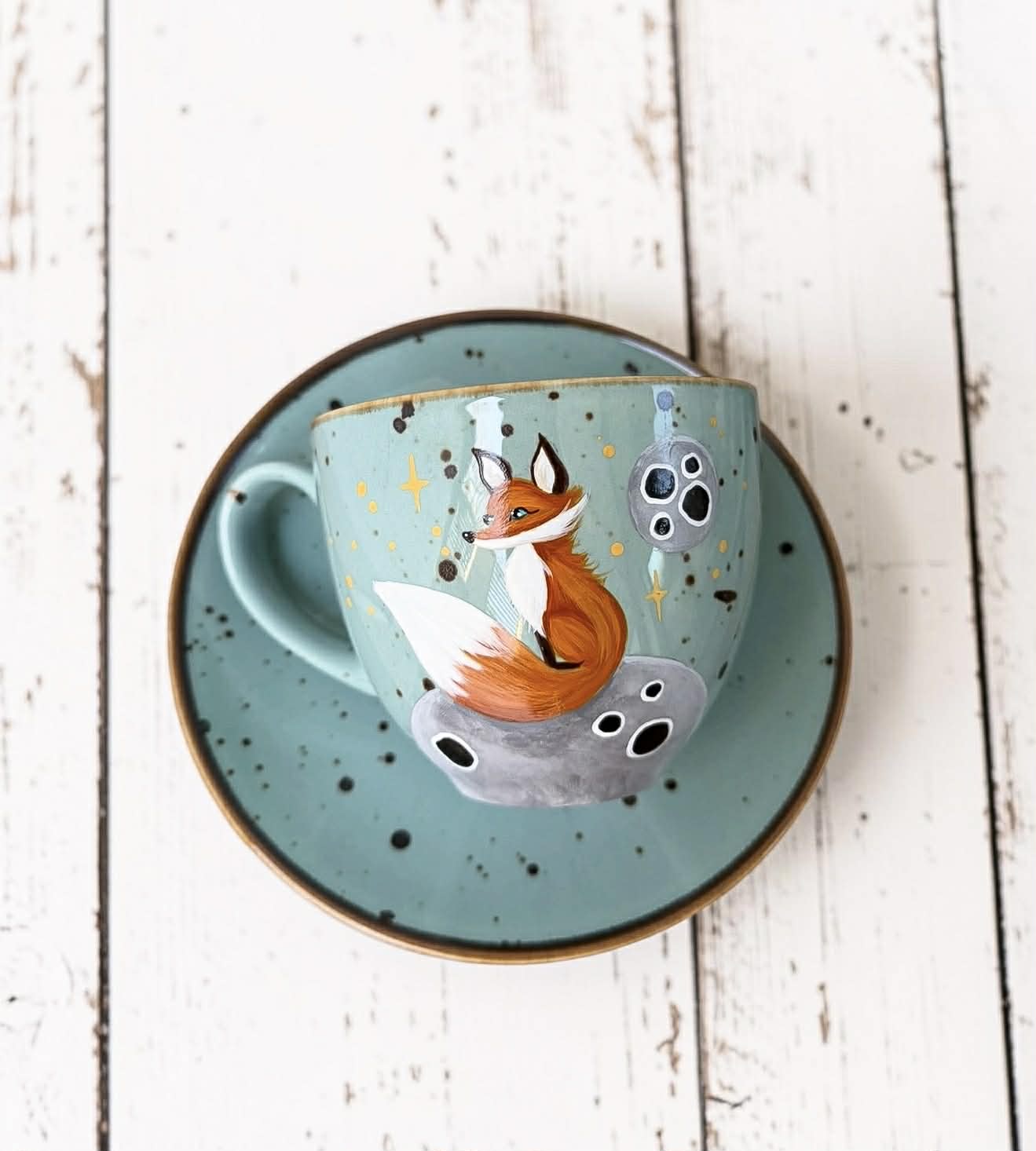 Ręcznie malowana filiżanka z motywem lisa na planecie.