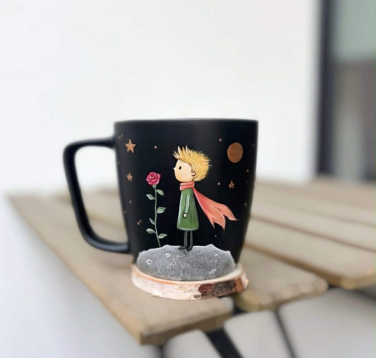 Ręcznie malowany kubek z motywem chłopca i róży.