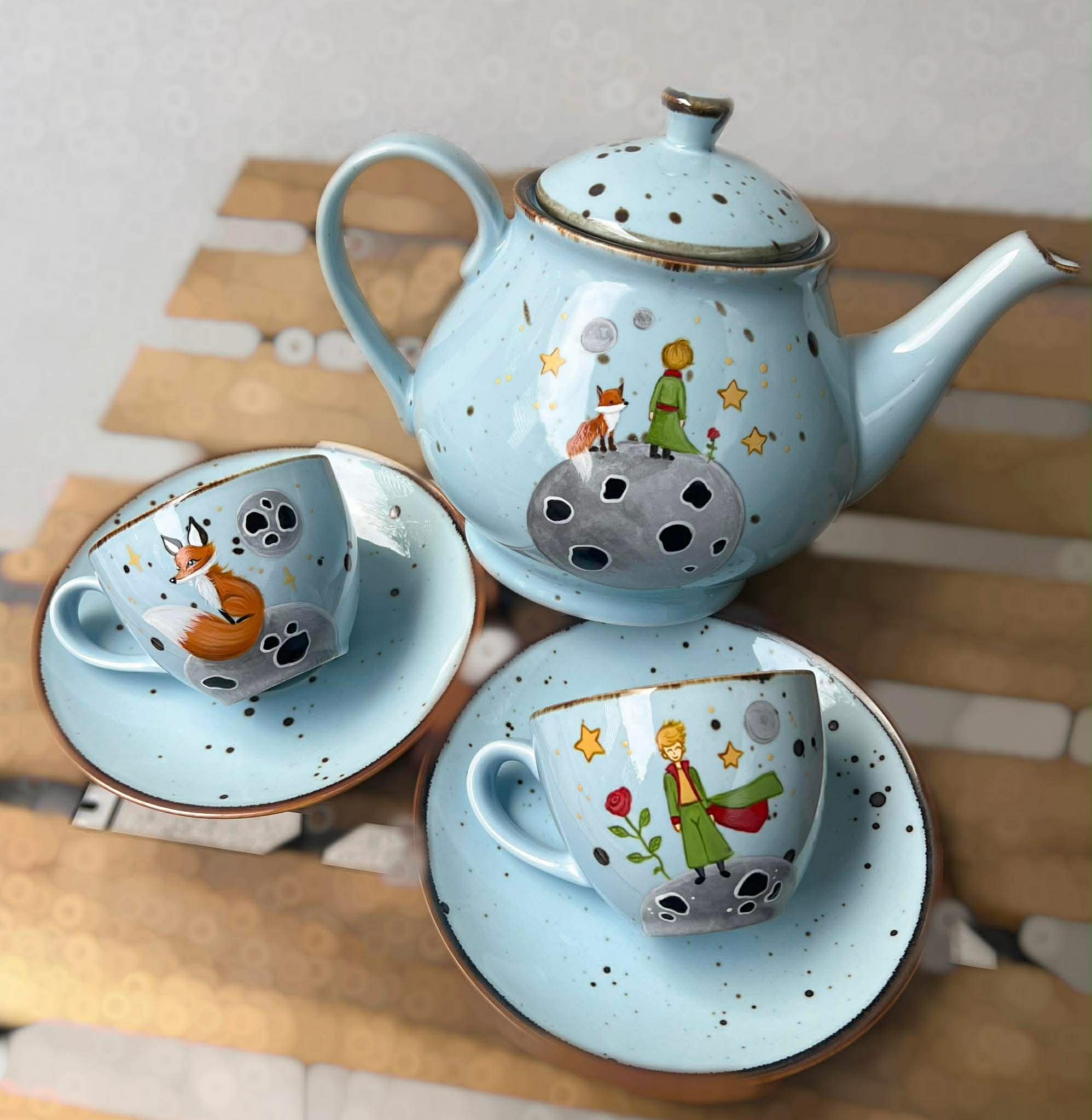 Ręcznie malowana zastawa w błękitnym odcieniu – filiżanki i imbryk z unikatowymi ilustracjami liska, planety i gwiazd. Idealna do codziennej herbaty, wyjątkowej kawy lub jako zachwycająca dekoracja i kolekcjonerski skarb dla miłośników literatury i sztuki.