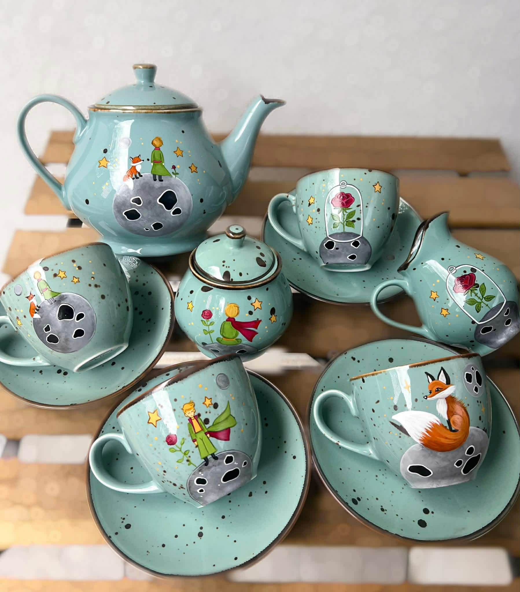 Ręcznie malowana zastawa w miętowym odcieniu – filiżanki i imbryk z unikatowymi ilustracjami liska, planety i gwiazd. Idealna do codziennej herbaty, wyjątkowej kawy lub jako zachwycająca dekoracja i kolekcjonerski skarb dla miłośników literatury i sztuki.