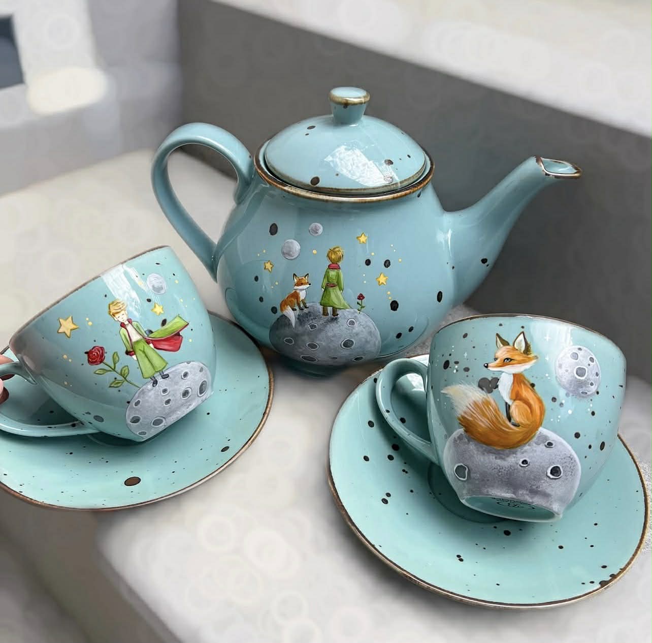 Ręcznie malowana zastawa w miętowym odcieniu – filiżanki i imbryk z unikatowymi ilustracjami liska, planety i gwiazd. Idealna do codziennej herbaty, wyjątkowej kawy lub jako zachwycająca dekoracja i kolekcjonerski skarb dla miłośników literatury i sztuki.