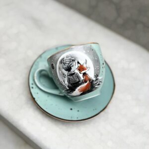 Ręcznie malowana filiżanka z motywem chłopca i róży.